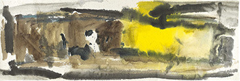 作品《秋田》是畫家2014年,以秋色為題的作品。與同一時期「井、山、田」 系列相呼應,也可說成是畫家從半抽象風景畫,逐步轉移到以「田」字的方型創作概念入畫的變奏時期重要代表作之一。畫面是由三個方型組成一個長方型,土黃褐等色階與水分飽滿的墨色筆韻在畫面上奔 ,凸顯畫家嫺熟的彩墨畫功底。