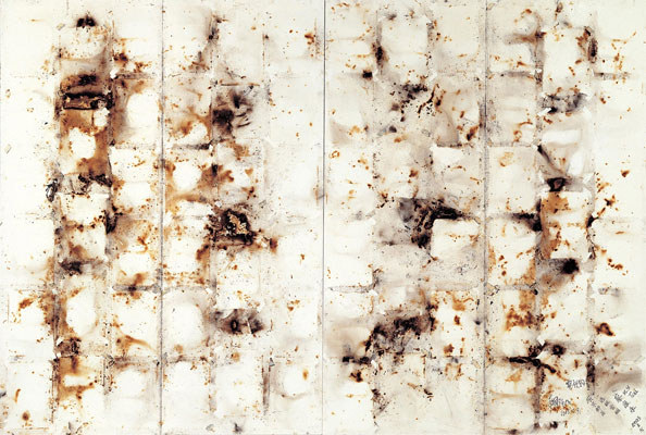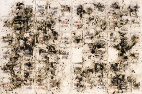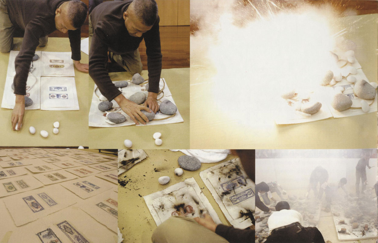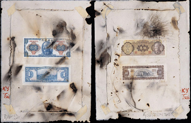金圓券是國民政府為了控制通貨膨脹,1948年8月19日在上海發行,然而物價飆漲,金圓券快速貶值,一年不到即停止發行,成為世界上壽命最短的貨幣。對照金融風暴襲擊後的今日,頗有警示與嘲諷之意。而在古董紙幣上爆破,沒有毀損國幣之虞,反而轉化為傳統版畫式的「平安符」。藝術家挑選了「錢幣」和「護身符」這兩種一般普羅大眾容易接受的物件,作為其藝術品的「賣點」,加上購物專家口中的增值性,透過傳媒成功行銷藝術品。