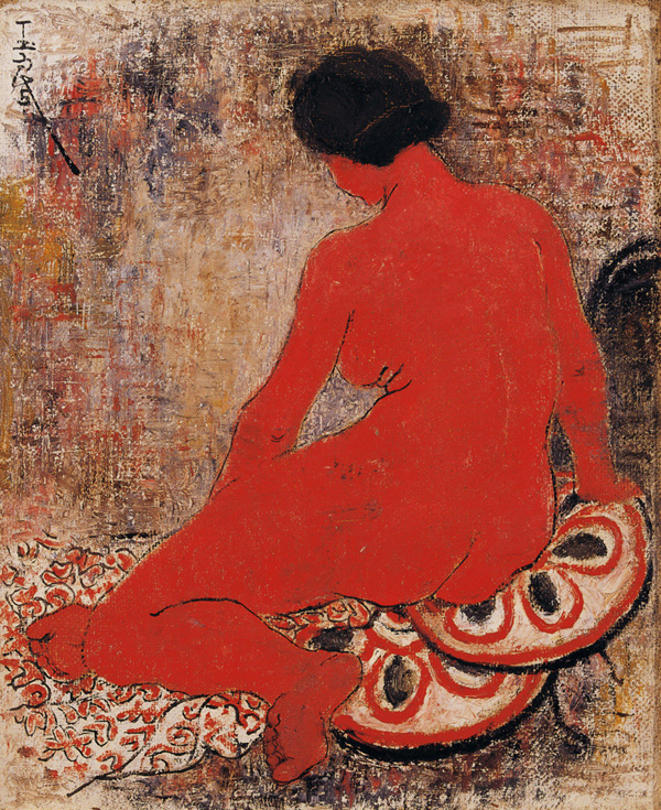 此件拍品《裸女》完成於1951年 ,正值藝術家從油畫融入水墨技法的發展成熟階段 ,而此時在油畫的創作數量逐漸精簡,投入更多彩墨畫的研究。這幅畫裡的背景採東方的留白概念,深色線條勾勒出紅色裸女的背影姿態。女性身體是可說是貫穿藝術家一生的重要元素。當她就讀上海美專之前,校長劉海粟因為裸體畫展事件被保守人士斥為「藝術界的叛徒」,模特兒教學又遭遇軍閥的控告。而在海美專求學期間,潘玉良特別在人體繪畫上花費心思,後來發生在女子公共浴堂觀察女體作畫,遭受辱罵、毆打的淒慘情況。然而,種種困難險阻並未打消她在裸體畫上的方向,反而更加堅定決心。甚至在封閉的民初年代裡,對著鏡子描畫自己的裸體。偏愛繪畫裸女畫的潘玉良,到了自由巴黎之後更得以盡情發展。