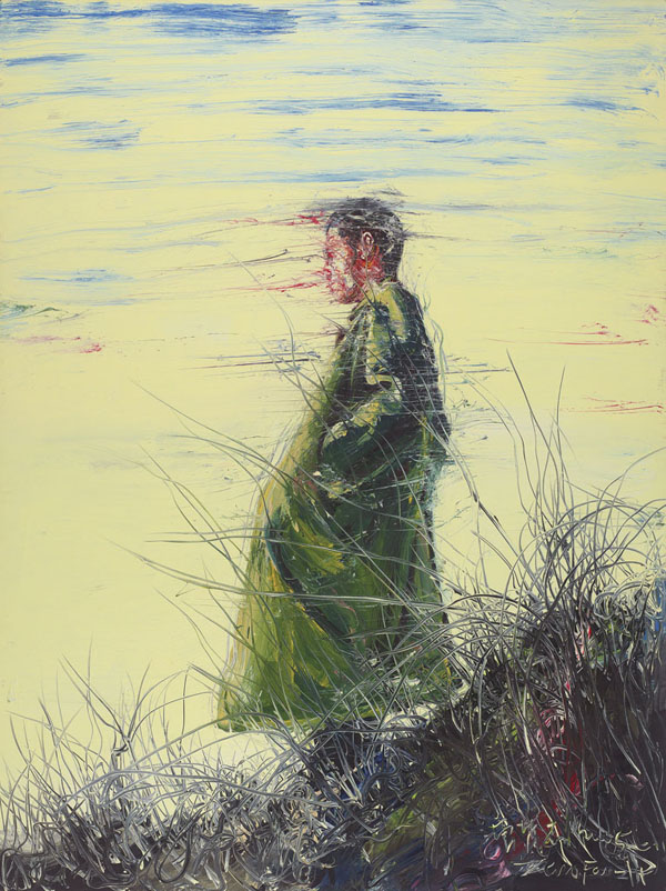 曾梵志的《天空》是其經典「天空系列」的代表作。此系列開啟於2004年,呈現出一個人在混亂與不屈服的世界中的不安、焦慮與困惑。在畫中,一個身影頎長的人佇立在山坡上,雙手插在口袋中,一臉困惑與茫然,讓畫迷一眼就能認出這是曾梵志的作品。描繪在日漸冷漠的社會中人的疏離感與孤獨感已成為曾梵志的典型畫風。