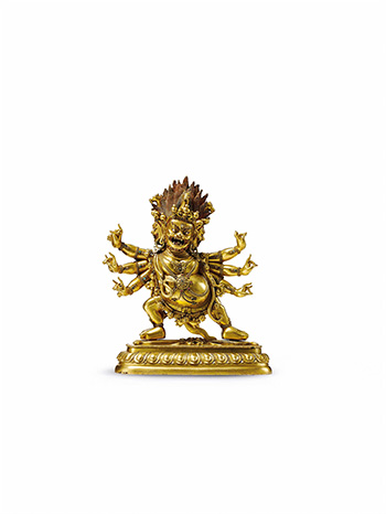 此尊馬頭金剛像三頭六臂八足,赤髮衝冠,髮間有馬首,頭戴骷髏冠,面部猙獰可怖,濃眉大眼、三目圓睜,大口獠牙,表情十分誇張。馬頭金剛的六臂原應各持法器,右上手持金剛杵,第二手持三叉戟,最下手持劍;左上手施無畏印,第二手持矛,最下手持索套。然法器單獨鑄造,持於手中,經久難免散失,通過右側尚余金剛杵與劍柄,依然可見手持法器之精妙。該尊馬頭金剛坦胸赤臂,耳掛圓鐺,胸配繁複瓔珞,臂戴圓珠釧環,腰圍人頭蔓墜飾,繫錦布,足踏長蛇,表示降服羅剎、鬼怪、天龍八部之一切魔障,消無名業障、瘟疫、病苦、免一切惡咒邪法等。立於單層覆蓮台座,上下緣飾以清晰的連珠紋。本尊為清乾隆時期造像,通體黃銅鎏金,鎏金亮麗,做工精細,多處鑲嵌寶石,肢體塑造細膩,動態把握到位,工藝十分精細,充分體現華貴富麗的效果,為不可多得的精品。