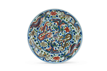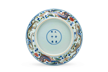 龍鳳紋是明、清瓷器常用的裝飾題材之一。由龍鳳組成的畫面,稱為「龍鳳呈祥」,屬於內府專用經典的吉祥紋飾。常見御瓷之中多裝飾一對或二對龍鳳紋,但本品則品格非凡,一器之上裝飾六對龍鳳紋,有清一代唯見康熙一朝出現,後世清宮御瓷再沒見同類燒造。其盤底雙圈書「大清康熙年製」六字兩行楷書款,本品造型端莊周正,胎骨精細,釉汁瑩白似玉,整器以五彩繪龍鳳穿花紋飾,盤心雙圈內飾追龍趕鳳,龍鳳各二,四首相對,中間以牡丹花卉間隔開來;內壁亦繪有雙龍雙鳳;盤外壁與內壁構圖相似,繪雙龍雙鳳。加之所繪龍鳳寓意吉祥,構圖疏密得當,係康熙五彩官窯典型器。