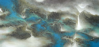 該畫作為容子敏遊歷台灣太魯閣國家公園之後,那雄偉壯麗的峭壁,蜿蜒曲折的泉水給容先生留下了深刻的印象,由此作畫。畫面中岩石崇山靜立蒼翠山谷之中,流水、瀑布隨處滿佈,在容先生的畫筆下,如人間仙境,暮色蒼茫,煙雨淒迷,將渺無人煙,世外桃源的美景表現得淋漓盡致,站在此畫面前,讓人將社會世俗的煩囂撇去,留下的是靜謐的心靈,就如容子敏想表達的「水流心不競,雲在意俱遲」這樣的人生哲理,我們活在急速的城市,也許需要緩下來,寄情於一刻的恬靜。借晉代潘岳的一首賦來表現所想。《滄海賦》:「徒觀其狀也,則湯湯蕩蕩,瀾漫形沉,流沫千里,懸水萬丈。」容子敏受英國浪漫主義畫家William Turner及法國印象派Claude Monet的影響,畫風揉合了中西技法,既有豐富鮮明的色彩,又不失傳統水墨之淡然物外的氣魄。