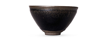 此樣式茶盞乃建窯最經典器型,其造型特徵為建窯蘆花坪產地所燒製;唇口微侈,外壁沿下一圈為束,為鬥茶止水線所設,美觀實用並舉,深符宋人藝術美學。深腹、底承淺圈足,口沿釉薄,內外黑釉發青乃上等發色,免毫垂流微細條紋並列,條理清晰。建盞窯變效果的呈現取決於窯室氣氛,窯溫,窯位等諸多要素,非人力所能,故每件建窯均具唯一特性,已不光是手工、胎釉工藝之差異而已。此茶盞燒製極精美,身形俊秀,由於使用痕跡明顯,排除窯址所出的可能性。日本學者「藤岡了一」是一專精中國高古瓷器收藏家,銀色兔毫斑紋突顯所謂銀兔毫的特色及優美品相保存完美,難得一見。