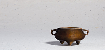 銅質精良,皮色栗紅,厚澤如脂。通體圓口平唇,溜肩垂腹,肩兩側起一對扳耳,腹下急斂,下承三乳足,底部署方框橫書「袖雲居」三字篆體陽文款。是件押經爐肥腹圓肚,整體重心下垂,搭配肥碩的三乳足,撐起全器重量。惟略顯纖細的扳耳,又讓穩重的器形,增添飛動的輕盈美感,故能令人愛不釋手。