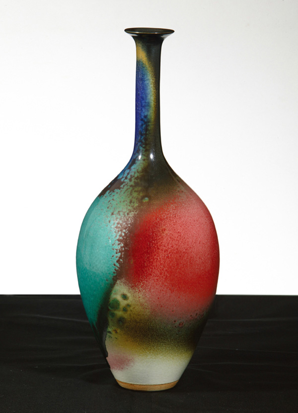 從民國四十八年起,開始以長石為主要的溶劑,含鉛的熔塊及鋅為輔助溶劑,及不同比例的鈣和土,與發色用的氧化金屬,調配出多種耐高溫的釉色;無論是經過從1230℃的氧化焰燒,到1280℃以上的還原焰燒,釉彩經高溫熔融後,所顯現的變幻效果,件件彌足珍貴。一件多彩釉的作品,幾乎同時要上多種不同性質的釉料,又不相排斥,燒製後才能顯現出豐富、多變的效果。