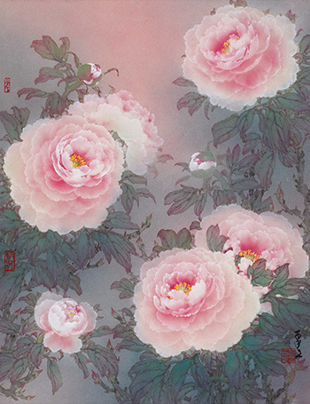 This painting featured the artist's potteries from his backyard. The artist carefully chose his favourite subjects to be featured in his paintings. From this painting, peonies are depicted with Zhao Shaoang's style of depiction. Each petal is depicted with the differentiation of colour and tone, creating a graceful peony.
