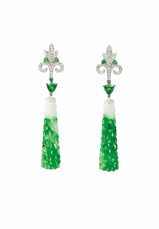 A PAIR OF JADEITE, GREEN GARNET AND DIAMOND EAR PENDANTS,