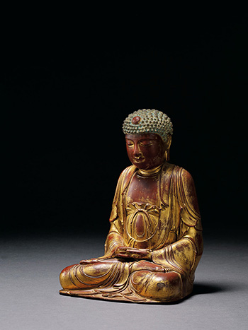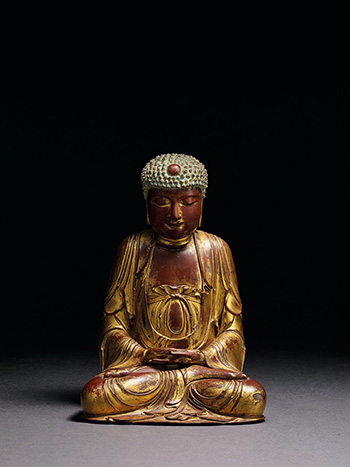 此尊阿彌陀佛頭飾螺髮,排列規整,額頭寬頤,面頰豐滿,雙目低垂,鼻型圓潤挺拔,面含笑意,雙耳飽滿伏貼,神情肅穆安定,尊貴之神韻,雙手結禪定印,雙腿結跏趺坐,這是一尊典型的漢地氣質宮廷風格造像,整體氣息內斂,袈裟曹衣出水的線條如一氣呵成一直貫穿到盤腿處,衣褶線條簡約有力,凸顯了身軀的健碩感, 漆質工藝達到極致,讓整體的協調性和視覺效果得到最好的表現, 顯現了古代藝術家的高超水准和精湛技藝。