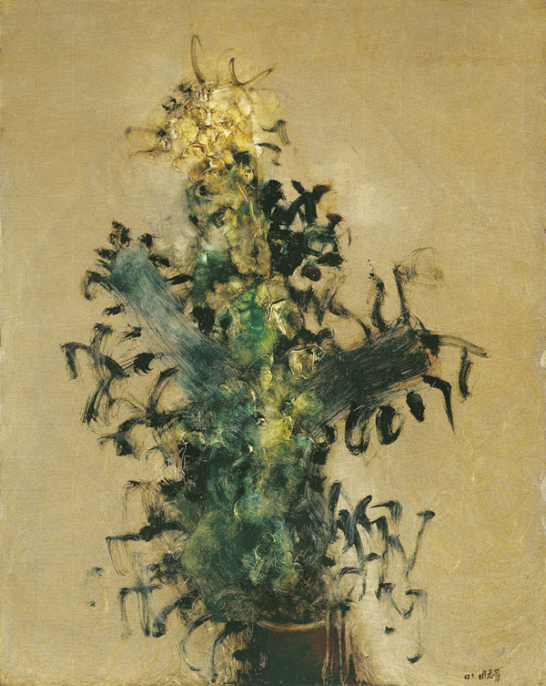 1990年代初從德國留學回國後,周春芽開始創作具有中國傳統文化內涵的作品。《瓶花》是1993年周春芽轉向一系列以山石和瓶花為題材的作品之一。這一時期周春芽將自身中國山水畫及寫意花鳥的心得充分展現在創作上。藝術家誇張了瓶花的傳統造型,同時在畫面中充分發揮油畫的材質特性,豐富的細節和肌理置換傳統筆墨柔淡纖弱的質地,繁複錯落的體積結構改變了文人繪畫扁平的視覺特性。在此系列的創作中,周春芽一直在尋求與大自然更加親密和自發的關係,以便能夠捕捉其最為本質的形式和表現。周春芽描畫的瓶花從其畫面周圍的空白中獲得力量,所用的筆法極為精練,如同八大山人畫中的一尾魚,一塊石,一隻鳥,一筆不多,一筆不少。著名評論家殷雙喜評價周春芽:「將宋元古典山水的意象與西方繪畫框式取景奇特地組合起來,具有了一種跨越人文地理與歷史文化的超然氣息,使人們猶如進入宇宙洪荒、天地蒼茫的夢幻境界。」