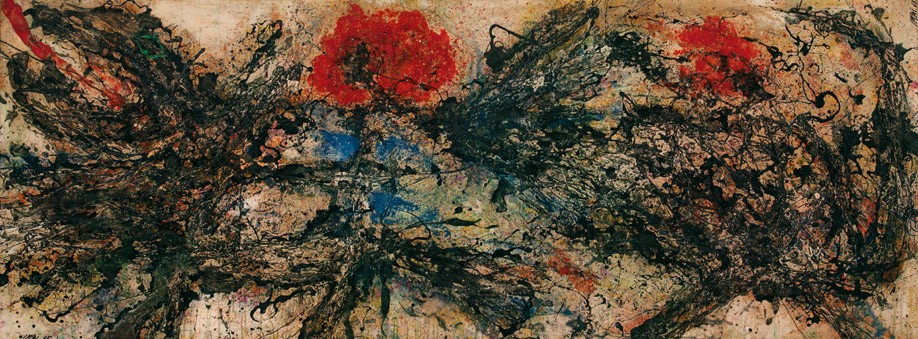 1955年,在法國藝術評論家米歇爾.塔皮耶(1909–1987)的介紹下,今井和無形式藝術的領軍人物杜布菲以及福泰爾建立了關係。在新的印象和影響下,今井的藝術風格出現重大轉變。1950年代末的畫作呈現激烈和厚重的機理,使用紅、黃、黑等鮮亮色彩,畫面具有極為猛烈的震顫感。但背景則顯示出中國瓷器般的寧靜之美。具有東亞風格的感性確定了今井無形式藝術家中的重要地位。今井在探尋和西方現代風格不同的美感。1960年代創作的華麗而具表現力的畫作主要使用紅色,著色濃重,顏料呈螺旋或放射狀線條滴流。這幅作品《盛開》是今井當時創作風格的代表作,黑紅相間的顏色嵌在自然的背景下,潑濺的顏料呈現出能量和動感。