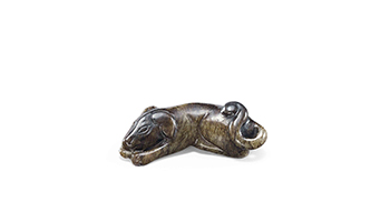 This Jade is sensitively modelled as a recumbent dog with its head reating on the front leg, and the tail curling against the hind leg. The craftsmanship shows the distinctive style of Song-Yuan dynasties.