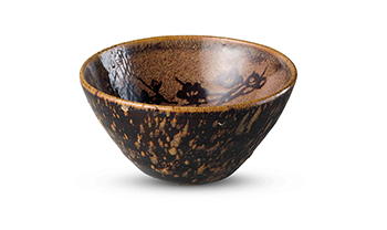 碗侈口,斜鼓腹,矮圈足。外施醬黑油,點灑黃褐釉,旋坯痕跡明顯,釉薄處略顯醬黃色弦紋。其斑點黃釉,潑灑自如,不著匠氣。內壁施黃褐釉,在釉汁將凝時貼上剪紙,入窯煆燒之後,得見桃花兩支,竹葉三片,鴛鴦一對。剪紙線條流暢細膩,構圖清新雅麗,實為剪紙貼花盞上乘之作。