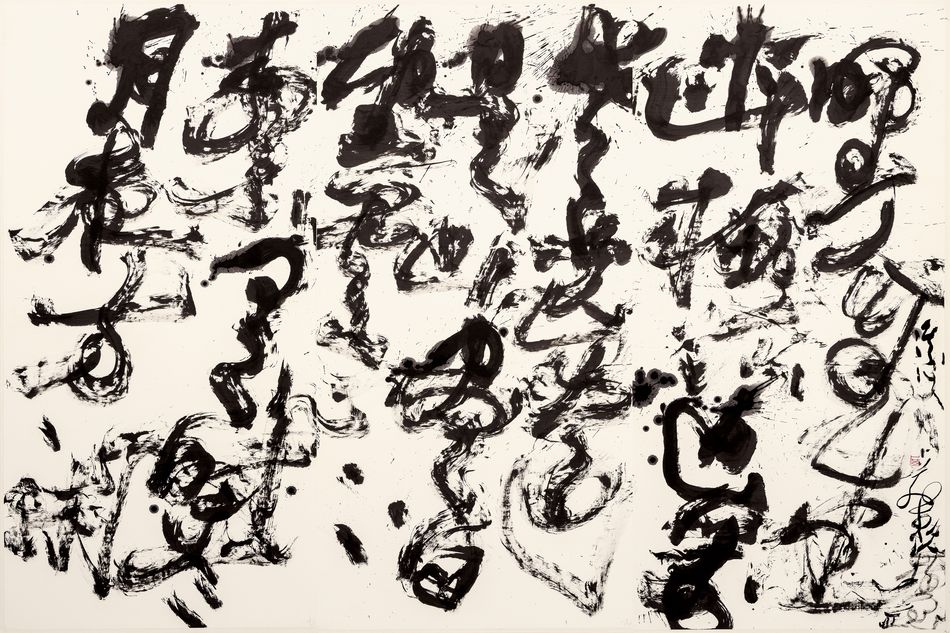 本件初觀「氣勢雷霆激如電」,但細品則見卜兹採用相對疏朗、整齊的章法進行佈排,以呼應詩句恬淡幽遠的意境。這份巧思使本件在狂草的面目上帶有靜謐的調性。全作至末段,佈白漸趨開闊,營造出詩句中雲散月明的氛圍,將夜色的清朗與心境的澄明一併呈現於紙上。卜兹〈夜方閑〉將元稹的恬淡演繹為浪漫活潑的自運詩,為當代書法繼承與突破傳統的經典範例。