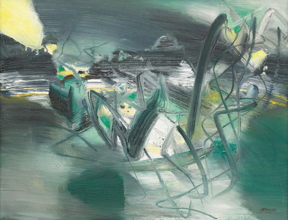 此幅《綠色山水》即為朱德群1980年代的作品。沉穩的深綠色主調賦予畫面一種神秘而充滿內涵的氛圍。綠色展現大自然與生命力,也隱含著一種探索或追求的過程,一種對自我和外部世界的思考。而畫面中點綴的黃色色塊象徵著希望、光明充滿著奔放的能量,線條紛繁交織,營造出強烈的動感,彷彿一部濃郁而有力的交響樂曲。在展現大自然的風采的同時,更能感受到藝術家內心的熾烈情感。
