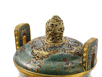 琺瑯彩釉鮮明艷麗,整體金碧輝煌,體現了盛清時期掐絲琺瑯工藝達到高峰。本器以象首為足,故以「太平有象」之名,寓意天下太平、五谷豐登。器身飾連綿不斷纏枝蓮紋,具有「生生不息」之意,寓意吉慶。