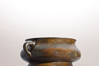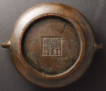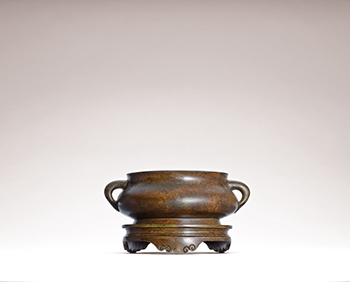 銅質精純,通體呈栗殼色,局部有褐斑,參差相映,目不暇給。圓口平唇,束頸,扁鼓腹,腹下漸斂,下承外撇廣圈足,底面署方框橫書「宣德年製」四字篆體陽文款。是件銅爐兩側做蚰龍耳式,圈足下附原配有束腰三雲頭矮足圓盤底座,全器線條圓弧有度,玲瓏合律,是蚰龍耳圈足爐中的典型佳器。