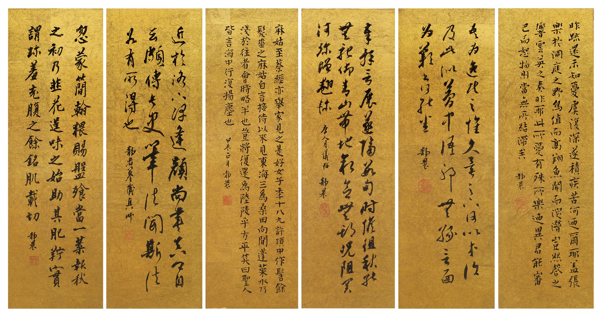 臺靜農《靜農書跡遊古》文房書法六屏 1964 水墨 金箋畫仙板 屏風 30 x 9.5 cm (每件)