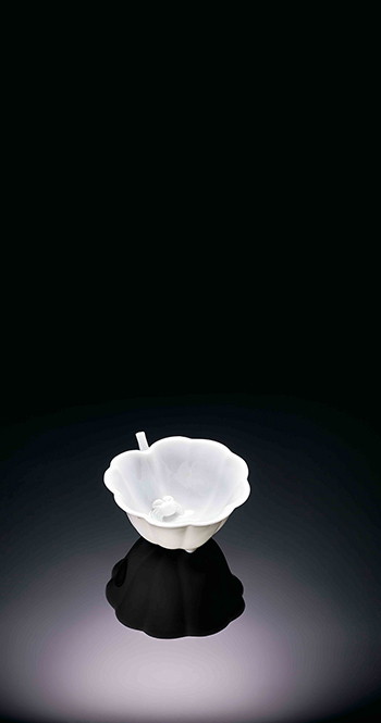 The cup is molded to resemble the tapering form of a rhinoceros horn libation cup, covered overall with white glaze, carved into the shape of lotus blossom and leaves. Inside the cup a small crab is carved as a decoration. The glaze is bright and smooth, of an even white colour .