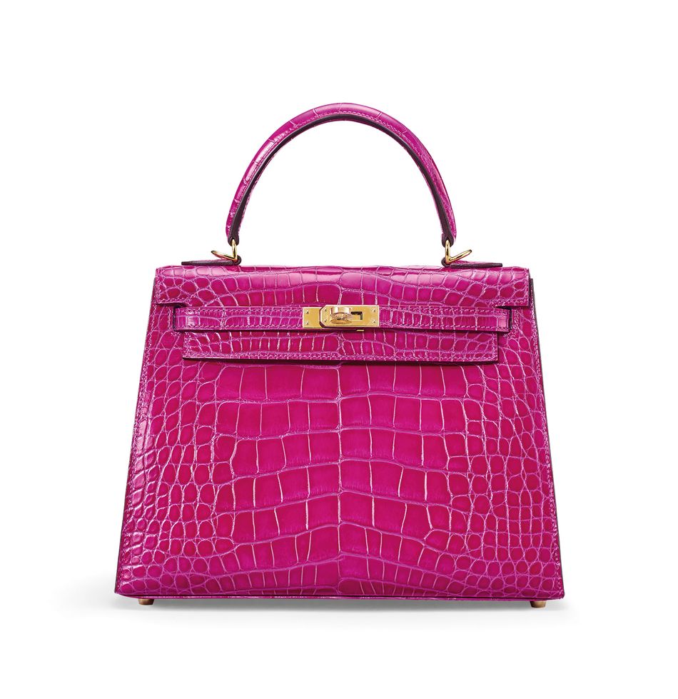 A CUSTOM BI-COLOR SHINY ROSE POURPRE ALLIGATOR SELLIER KELLY 25 WITH GOLD HARDWARE
