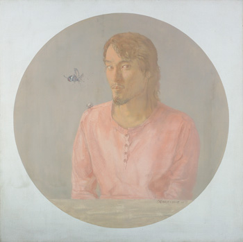 這件作品創作於2005年,屬於彭斯代表性的男性肖像作品。畫面中的男子面容清秀,一隻蝴蝶環繞在側,另一隻則安然落定在他肩上,他視線卻直直地投向畫面外的觀者,眼神中透著一股讓人無法忽視的堅定。畫家無疑深諳對比在藝術中的力量,在這樣的一張一弛間,讓原本穩定、淡雅甚至有些混沌的畫面變得有力鮮明起來,畫家準確有力地傳達出畫中男子對於畫面外世界的冷眼旁觀下的思索與反詰。