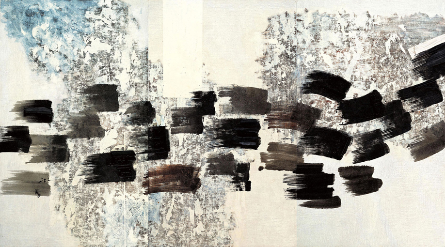 《飛天》三聯幅如行雲流水般流暢,帶有東方的情懷,也具抽象表現的形式。然而,隱藏在黑色筆觸中崩解的傢俬,斷裂的窗花剪紙,何嘗不是藝術家對經典文化的追尋與喟嘆呢?蘇東坡有言:「寄浮游於天地,渺滄海之一粟,哀吾生之須臾,羨長江之無窮;挾飛仙以遨遊,抱明月而長終。」藝術家近年的審美思考,融入更多的禪意哲思,效法古人的自在胸懷,企求心靈得以同飛仙逍遙翱翔。
