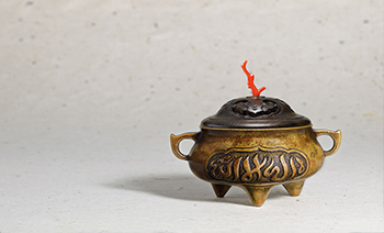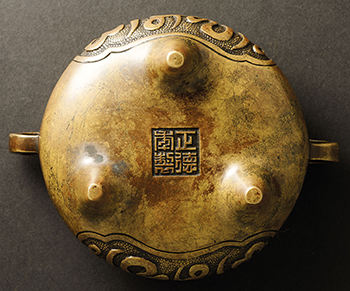 精銅鑄造,銅皮蠟茶色原底上間有栗紅浮動,形成斑斕典雅的視覺妙趣。全器圓口平唇,溜肩廣腹,肩兩側出線條方折的扳耳,腹壁外飾海棠式開光,開光內做珍珠錦地,錦地上飾陽起阿拉伯文,文字線條豐腴鮮活,底面下承三乳足,三乳足間署方框「正德年製」雙行四字篆體陽文款。是件銅爐造型飽滿,扳耳璫的反向上揚,恰與腹部的下垂曲線,成形恰到好處的拉鋸張力,故稱完美。