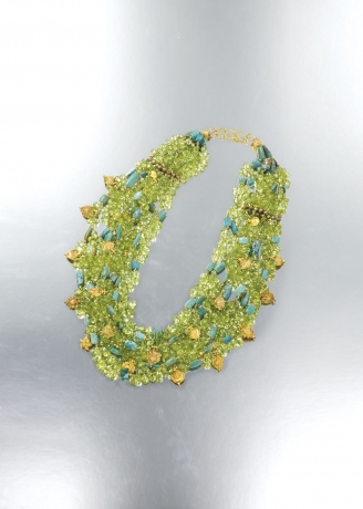 Comprising a necklace and two bracelets, each designed as multi-strands of peridot briolettes interspersed with turquoise beads and decorative gold charms; and a ring, set with an oval-shaped chrysoberyl to the diamond-set gallery and hoop, mounted in 18k white gold (two bracelets and a ring not illustrated), necklace 46.0 cm long, bracelets 18.5 and 19.0 cm long, ring size 5