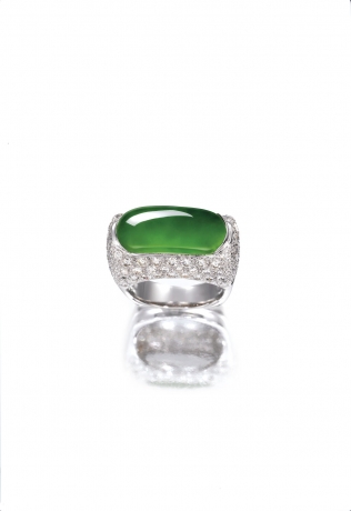 Set with a jadeite saddle top of bright green colour and very good translucency, to the pavé-set diamond half-hoop surround, mounted in 18k white gold, saddle top approximately 20.6 x 9.1 x 4.2 mm, ring size 8 ¼