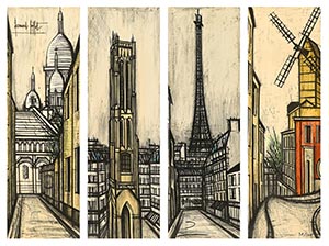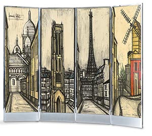 戰後的天才藝術大師:貝爾納‧畢費,對巴黎擁有深厚的情感與個人記憶。他分別於1957年和1988年,完成以巴黎風景為主題的系列油彩畫作。1967年《巴黎風景系列》的石版屏風之前,畢費已經於1960年與1961年先後創作過《安娜貝爾裸姿》、《樂器》兩組紙上石版畫屏風。而後創作的《巴黎風景系列》是畢費一生最大尺幅的風景主題石版畫作品。巴黎指標性的四座城市建築:聖心堂、聖賈各塔、艾菲爾鐵塔、煎餅磨坊。它們代表不同年代的建築風格及歷史事件,藉由畢費精準的筆觸,在狹長畫面上展演新一代巴黎風景,讓觀者一窺藝術大師視角的城市風貌。