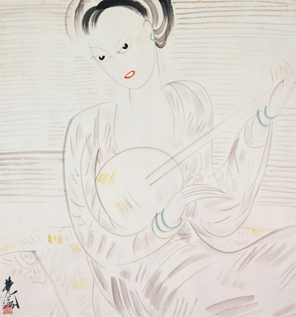 〈仕女彈阮圖〉的畫中女子雖然穿著洋裝,其修眉、杏眼、櫻桃口等五官的表現卻是屬於中國古典文學中美人的範例。「阮」是中國傳統樂器,在中國傳統繪畫裡有仕女彈阮圖像的記錄,最早源自敦煌石窟唐代壁畫的樂伎彈唱。抗日戰爭退居重慶期間,林風眠自然看過極為轟動的張大千臨摹敦煌壁畫展,1950年代初他自己也一度嘗試臨摹過敦煌壁畫。其實,林風眠無意於追求、遵循中國繪畫的軌跡,之所以採取彈唱的題材,當成創作新藝術的研究題材,乃是期望借助它們畫出比馬蒂斯更新穎的一種繪畫。他保留中國書畫勾描的技法、傳統仕女的開臉造型,不過在主角的神態、線性的畫面構成、裝飾性背景的運用上,則加入西方現代藝術的元素,形成林風眠格體的人物畫像。