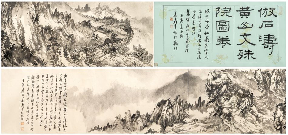款识:大千居士所藏石涛〈黄山文殊院卷〉写黄山烟云掩映之奇。其善用湿濡之笔,墨法点渍水墨相发,元气淋漓,大似梅花道人之妙。盖石师往来黄山二十余年,故其平生所作黄山松石为多,尝自题所画云:「余画得黄山之性情,不必指定其处也。」观此卷甚喜,临其大意,未尽圣妙,然于放逸随兴之处,略有所得。壬寅夏至,姜义才于鹤汀。