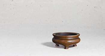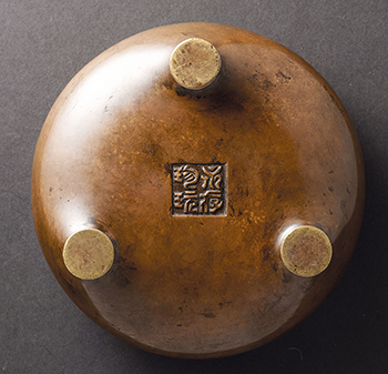 銅質精良,栗殼色皮,瑩潤光亮。盤口,束頸,扁圓腹,圜底,下承三短象腿足,底面署方框「永存珍玩」雙行四字篆體陽文款。是件銅爐造型古雅,盤口周緣的唇線與頸壁由一道凹弦紋所製造出的三道弦紋視覺效果,是鬲式爐展現圓弧之美的重要亮點。