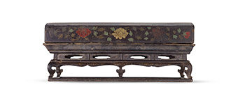 下蓋造型優雅複雜,蓋身上寬而下窄,四周彩繪牡丹花草紋,其下束腰開雲型窗,兩側為三彎腿,中有足,窗側及牙版上以金漆細繪花草紋,工藝細膩而精湛,並將八足相連,更顯沉穩之氣,雖是桌案之物,卻有明式家具之大器風範。蓋內有六孔,應是置放杯盞之用,蓋內描繪連枝葡萄,華貴中並富含興旺之吉祥寓意。