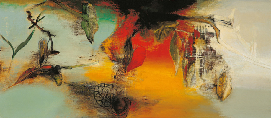 《倒影》是杨识宏于1998年完成的得意创作,他将自然界的植物抽象化,以丰富的色彩与流畅的线条,表现出植物旺盛的生机及自然界生生不息的循环,让观赏者的视觉随着线条的延伸与色彩的层次,深刻感受到杨识宏透过作品所诉说的丰富情感,让人有着无限的想象空间。