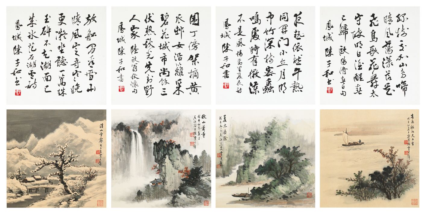 黄君璧;陈子和《四季山水》1978 水墨 设色 纸本 镜框 34 x 33 cm x 2(每件)