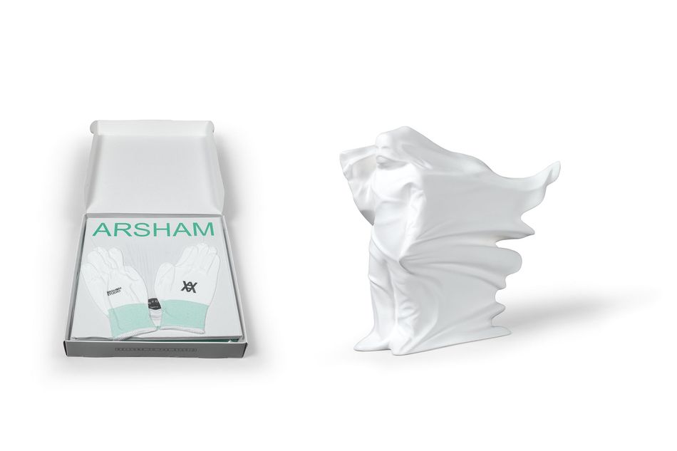書本 棉質手套 127/1000 樹脂 404/500 ;書本:31.5(長) x 27.5(寬) x 3.5(厚) cm; 雕塑:34(長) x 27.5(寬) x 31.5(高) cm