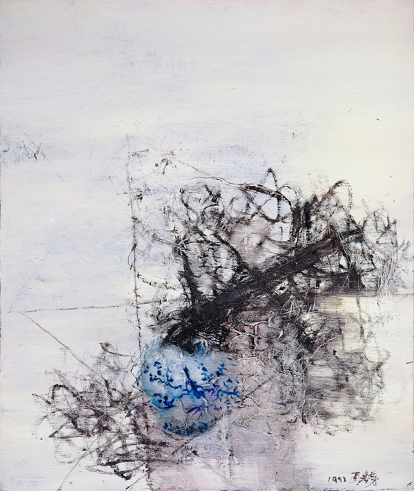 周春芽畫中富有表現主義傾向的極富書寫性的用筆,舉重若輕,恰到好處,其境界即便國畫寫意高手亦未必能窺。九十年代初,周春芽開始了他的瓶花系列試驗題材,他畫了一系列離經叛道的花瓶與花,人們通常只能看到一個約略的瓶子雛形,以及由極富動感的線條與色塊組成的花朵意象團繞花瓶。正是由這個系列起始,他開始了各種意象的系列創作。