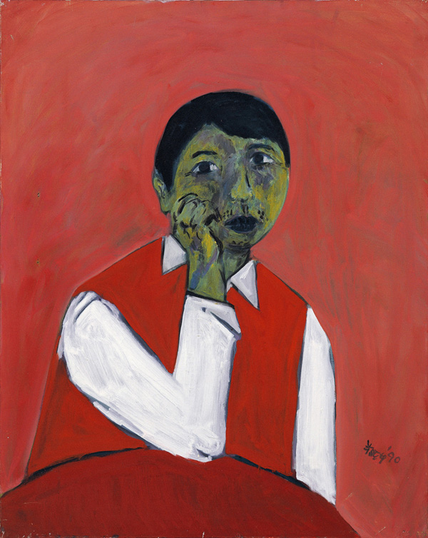During these years, Cheng painted a lot of self-portraits and family member portraits which narrated the painter and his family and friend's life. "Self-portrait in a Red Vest" reveals a life that is flat and innocent, also mingled with unspeakable sadness, the whole picture is succinct and lively, with clear outlines, and bright colors, he used brushes with fluffy brush hairs, with shades and two dimensional arrangements, made the character in the picture as if from the past, and reveals hope and dreams.