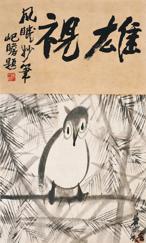 Lin Fengmian's bird pictures usually adopt light lines to draw a solitary bird up in the branch. Some researchers think these works are more like ordinary paintings, some think they represent the independence, unruliness, grief and indignation, pessimist inward world of the artist. In fact, there are many famous experts have produced pictures themed Great View, in which Qi Baishi's Great View as a tribute to Eagle, experienced touches draw the outline of Eagle's commanding, aloof and proud inviolability manner, create a "imminent danger" dangerous situation on the picture. But Lin Fengmian's Great View is themed at owl through painting, plump, rich and layered picture composition make the protagonist at the center of the picture appear perversely, but with lots of human emotions, the work was created in 1960s when the artist lived in convulsion, ups and downs. This work not only presents the artist's usual social stand and feelings of the time, but also highlights the artist's unchanged true nature in the adversity through the form of childhood fun performance of an owl.