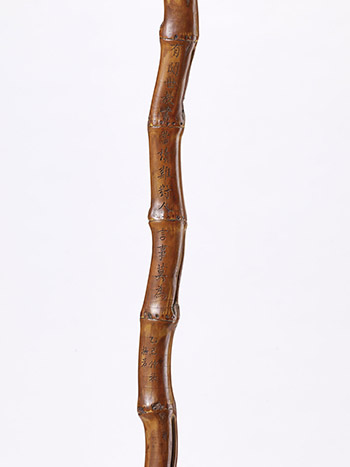 此手杖以一长条近乎笔直之竹子根部地下茎(称「竹鞭」)制成,实属鲜见。竹杖释文:有容乃大;有忍乃有济;有三公不易之介;有关世教书宜读;行事莫将天理错,无欲则刚;无爱即无忧;无一艺自用乃高;虽对人言事莫违;立身当与古人争。乙已仲秋梅岩