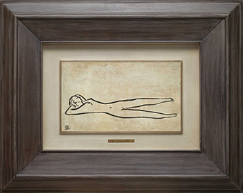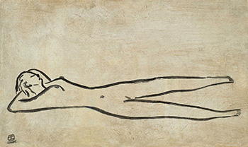 《沙灘上的裸女》則為常玉晚期創作,相較其他晚期帶有表現主義風格的身體曲線,此件畫作當中可見中國傳統木刻色彩,他捨棄了早期那如行雲流水般的書法性線條,轉而以充滿力道的卻不失宛若中國書畫乾筆技巧的氣韻,俯視的視覺角度將中國現代主義的平面繪畫可能性帶到另一種境界;畫面中蒼茫的大片留白對應了中國式的傳統美學,然而,此件作品的內容本身脫離了人體繪畫與物像的侷限;常玉精簡的裸女線條中,流瀉的不僅是中國式的感性美學,他高超的書畫智慧將古時騷人墨客情懷注入在此件繪畫之中,取於直覺,未曾矯揉,體現了畫中裸女身處萬籟俱寂的悠然自得與隨遇而安的精神性;他驚人地以幾筆簡單的線條,概括了身處兩的截然不同世界的矛盾與兩種龐大文化的碰撞衝擊,展現出質變的西方繪畫與本質上為中國藝術的精神哲學,即便晚年的常玉生活潦倒窮困,他依舊堅持著西方藝術和與生俱來的中國美學基礎,以和諧的筆畫實踐他理想的創作,終究使他成為一代中國現代主義藝術先鋒。