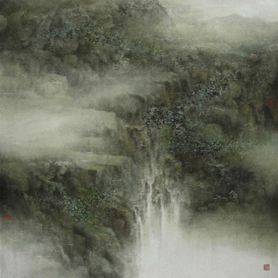 山水意境一向是古代文人生命理念的維繫,是人性的寫照,是心靈 寄託的家園。近10年間,社會經歷風風雨雨,悲喜交集。容子敏 選擇了「心遠地自偏」,潛心學習中國畫,承先啟後;其作品訊息 是要將社會世俗的煩囂轉移到靜謐的心靈,把無形的精神境界以筆 墨表現在有形的山水之中,藝術家喜愛遊歷名山大川,尋覓山水清 音,放緩步伐細意觀察,悠然自得,將所觀所感,以攝影、速記、 寫生紀錄下來,成為日後水墨創作的靈感。內心追求詩人杜甫的 「水流心不競,雲在意俱遲」這樣的人生哲理。 作品《春分》是其是移情系列作品之一,畫中的風景有如人間仙 境,暮色蒼茫、煙雨淒迷,然而又並非是一個渺無人煙、不存在的 世外桃源,而是一個世人可以踏足的美景。描繪的是山丘間的飛瀑 流泉,這也是他對「水」情有獨鍾的延續。藝術家認為山丘是既定 的事物,另一特色是流水、瀑布隨處滿佈,容氏認為我們的世界被 許多向上生長的物件包圍,如大廈、高山、樹木等,唯獨水是向下 流,靜靜地為萬物提供養份,不與他物相爭,流水能穿透亂石,不 受時間限制,靜靜地配合大自然的規律,是美,是永恆。我們活在 急速的城市,也許需要緩下來,寄情於一刻的恬靜。
