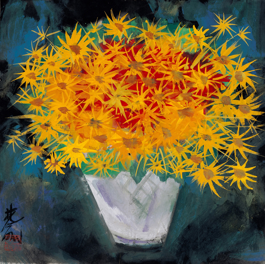 事實上,真實花卉的色彩沒有這麼斑駁,深厚而鮮明。這裡的菊花黃的多變而絢爛,紅色的襯托熱烈又有收斂,一改過去白色和粉藍色給人清麗脫俗的感受。但熱烈生命的背後,在表現形式上,畫家在背景上用寒色調子來減弱主體黃色和紅色給人們帶來的過分強烈的感覺,另外也使得觀者產生藝術家在克制內心壓抑和晦澀的情緒,讓生命的張力掙脫一切的枷鎖,嬌豔而出。林風眠畫花,體現了他是一個運用色彩的大師。經由畫家豐富的經驗,在調色板上創造出濃淡深淺的層次色彩,經過畫家內心世界在客觀世界尋找到最符合表達感情的處理方式。