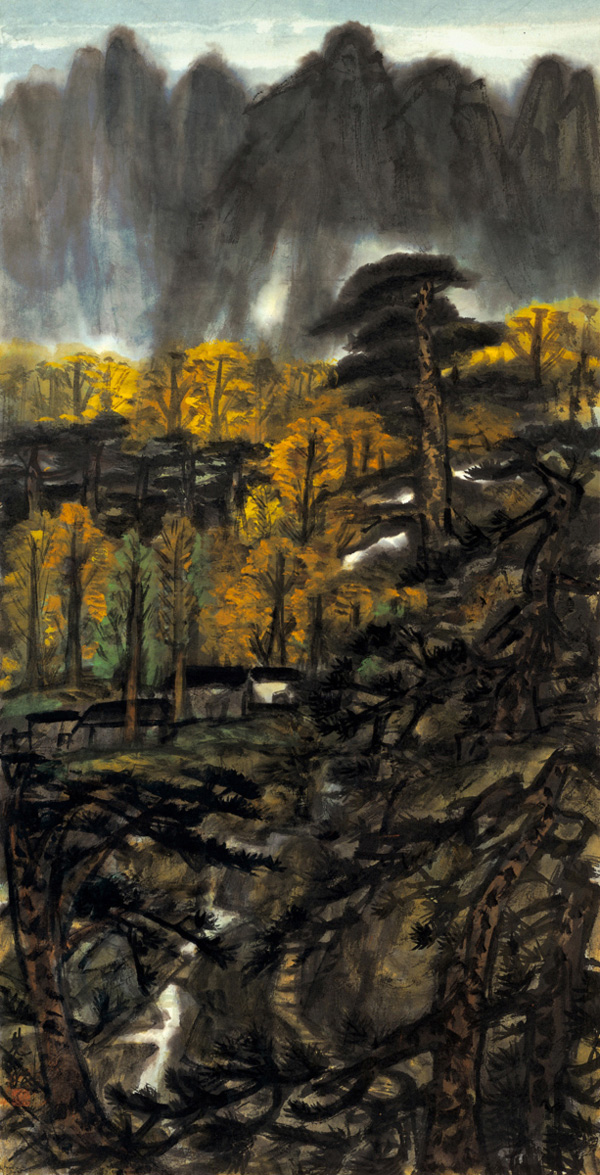 《黄山松涛图》是林风眠少见采取非方形、立轴构图的风景图画,完成于香港时期(1977-1991)。