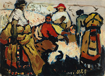 “Sheepshearing” is one of Zhou Chunya’s early representative works. He returned to European classical realism, focusing the structure of the picture on scenes of everyday life. This painting can also be seen as an indicative work of Zhou’s in that he turned away from the scar art he created in the past and started painting anew. Through depicting the scenes of the daily life of the Tibetan people, the artist consciously recorded the traditional aesthetic concepts he observed that belonged specifically to the local people, such as the umber tone, the thick blocks of colors, the rough lines, and the image of their unadorned life. In the painting “Sheepshearing,” detailed depictions of characters’ outlines are replaced by enthusiastic and unrestrained blocks of colors painted with large brushstrokes. The painter also intentionally avoids presenting the picture with an emphasis on bright and dim light and on the changes between the illusionary and the real. He avoided this technique that painters since the impressionists have employed; instead, in this painting, he emphasizes the texture performance of the figures’ volume and mass. The color composition also focuses on brown, a color Zhou favors.
