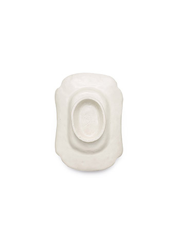 此盤仿金銀器形製,折沿,橢圓形高圈足。盤四個委角與四邊均有合歡花紋裝飾,其效果呈現浮雕的感覺,白色瓷胎通身施白釉,圈足底未上釉。底書「盈」字款。此件器物優雅,器形仿中亞金銀器形式,結合瓷器之溫潤特點更顯精緻典雅,其曾經的身世或為唐代宮廷中的一件器物也是極有可能。
