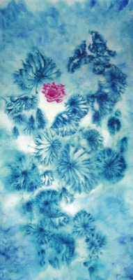 畫面極具表現力。大片藍色的荷葉盤踞在一抹緋紅的荷花周圍,在冷色調中獨留一點明亮。讓強烈的光線由畫中向外擴散,平衡了整個以冷