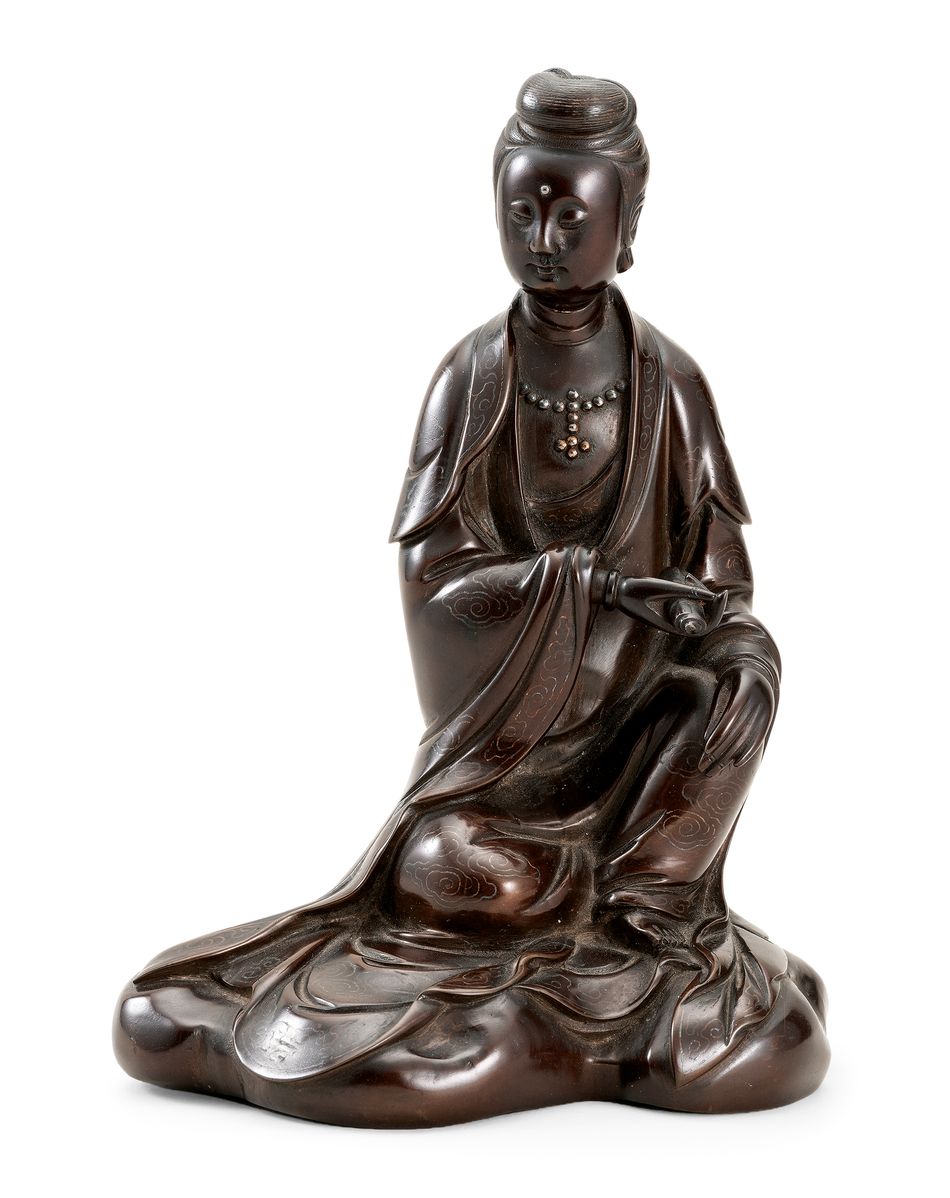 A Silver-inlaid Bronze Seated Figure of Guanyin, Shisou Mark