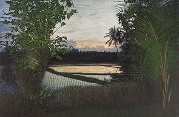 此件作品《一方心田》,開闊的水稻靜靜衡躺,晚霞照印出溫暖人心的微光,畫面中的針葉樹欉與矮灌木如被晚風吹拂般地擺動,如此和諧與靜謐卻滿溢著生命力與豐饒意象,亦在此般詩意不絕的畫作中,藝術家注入最真誠的情感,也在這樣的情緒之中找到了歸屬;在黃銘昌的藝術上,寫實畫亦被重新詮釋,他的作品不單是對於眼前風光的客觀表達,他沁入了滿滿的主觀思念,讓單純的寫實作品飽含情感層次,而這也是黃銘昌藝術難以被取代的指標精神。